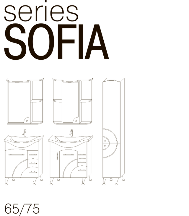 Серія Софія фабрики Ювента створена спеціально для любителів класичного стилю. Плавні і м'які лінії фасаду меблів для ванної кімнати надають їй вишукану витонченість, роблячи цю меблі дуже привабливою. Серія Софія фабрики Ювента представлена в різних розмірах, в декількох кольорах і в різних варіаціях дизайну. Велика різноманітність дизайнерських рішень дозволяє підібрати індивідуальність стилю Вашої ванної кімнати в різних розмірах. Серія Софія фабрики Ювента включає в себе: пенал, тумбу з раковиною, навісна шафа і зеркало.